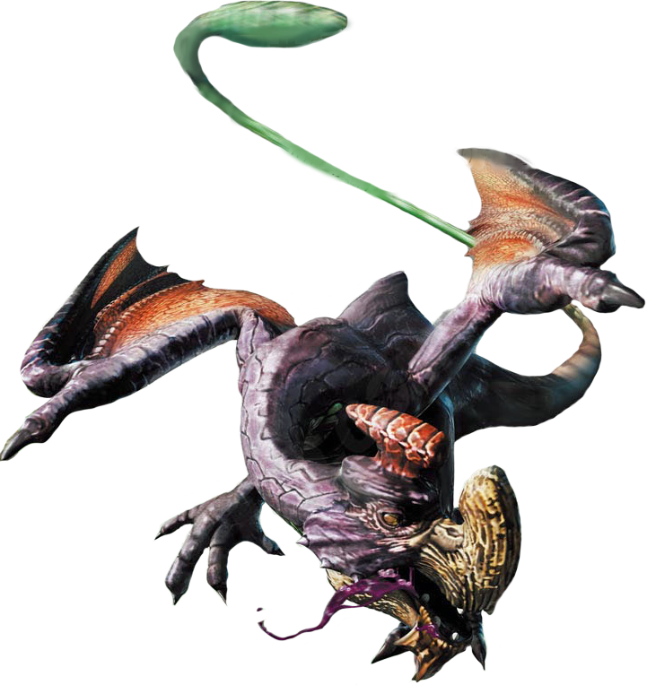 Gypceros has a subspecies known as Purple Gypceros that tends to live in hotter, more tropical environments although they can be found in all of the same habitats as normal Gypceros. [As large predatory monsters are more common in warmer areas, they have possibly evolved to produce more toxic poison to adapt.] They are also better at defending themselves, being more resilient and stronger than normal Gypceros. Their hide has a more vivid purple colour and their tails are green in colour as well, [probably serving as aposematic colouration to warn predators of their higher toxicity.] Besides that, they use their flashing attacks more frequently in battle and will chain other attacks directly into it.