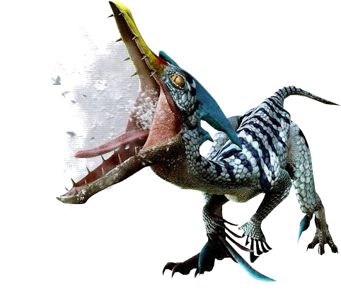 Social pack-hunting Bird Wyverns with white-scaled bodies covered with blue stripes. Nearly identical to Velociprey and Velocidrome, they have a single backwards-pointing crest on their heads and their beaks are filled with thin, spike-like teeth. Their forelimbs each have seven razor-sharp claws, and each of their hindlimbs bear an enlarged claw on the first digit which is held off the ground.