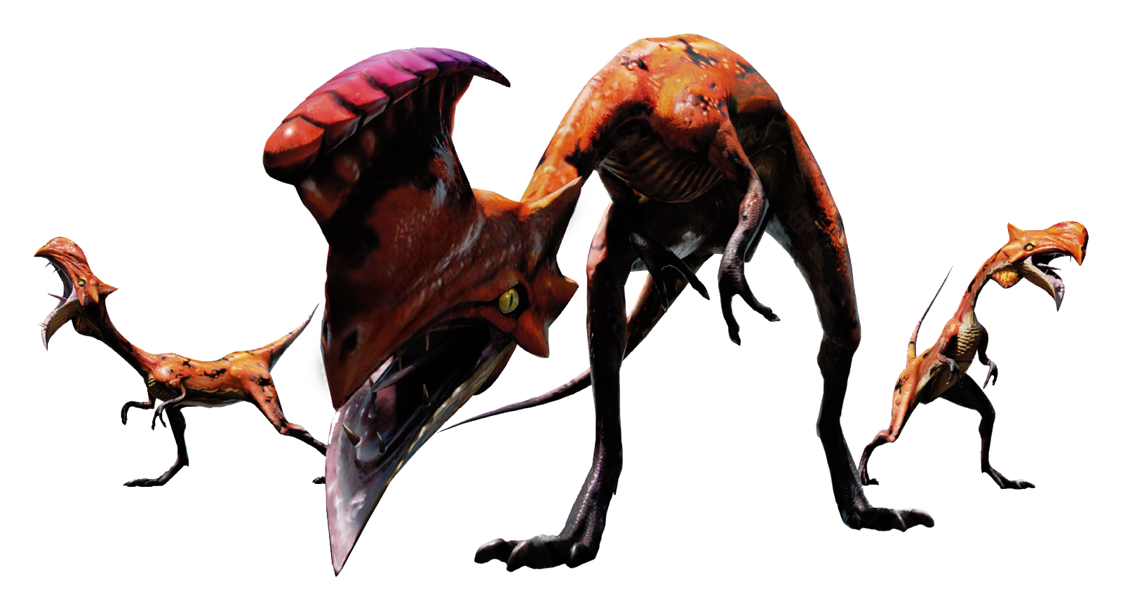 Social pack-hunting Bird Wyverns covered with a slimy orange salamander-like hide with black blotches. They have a single crest located on their snouts and small horns on the back of their heads. Their forelimbs only have two clawed digits each, and each of their hindlimbs lack the enlarged claw on the first digit found in its close relatives. They instead rely more on their poison which can be spat out or administered through the four pairs of venomous fangs in their beaks.